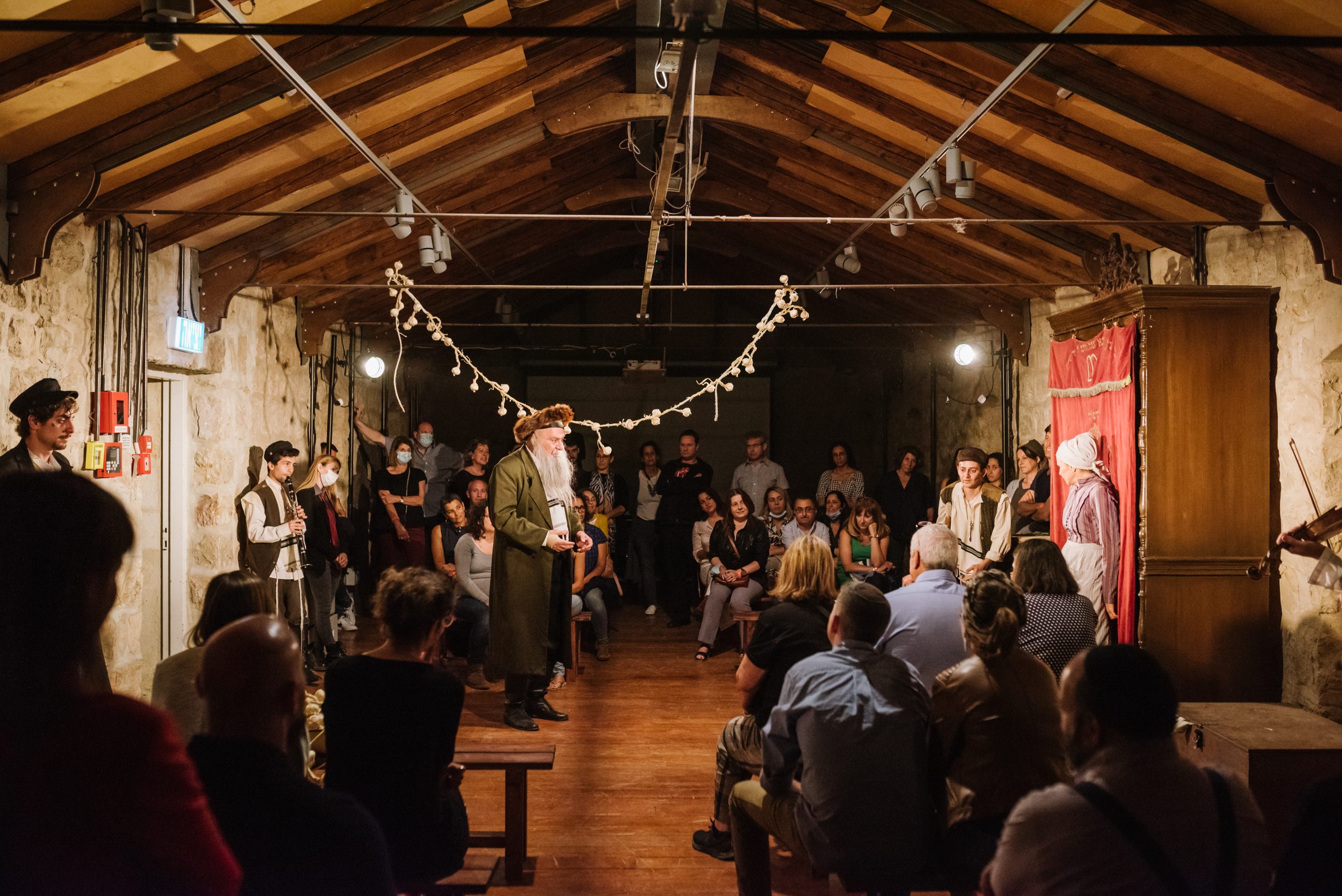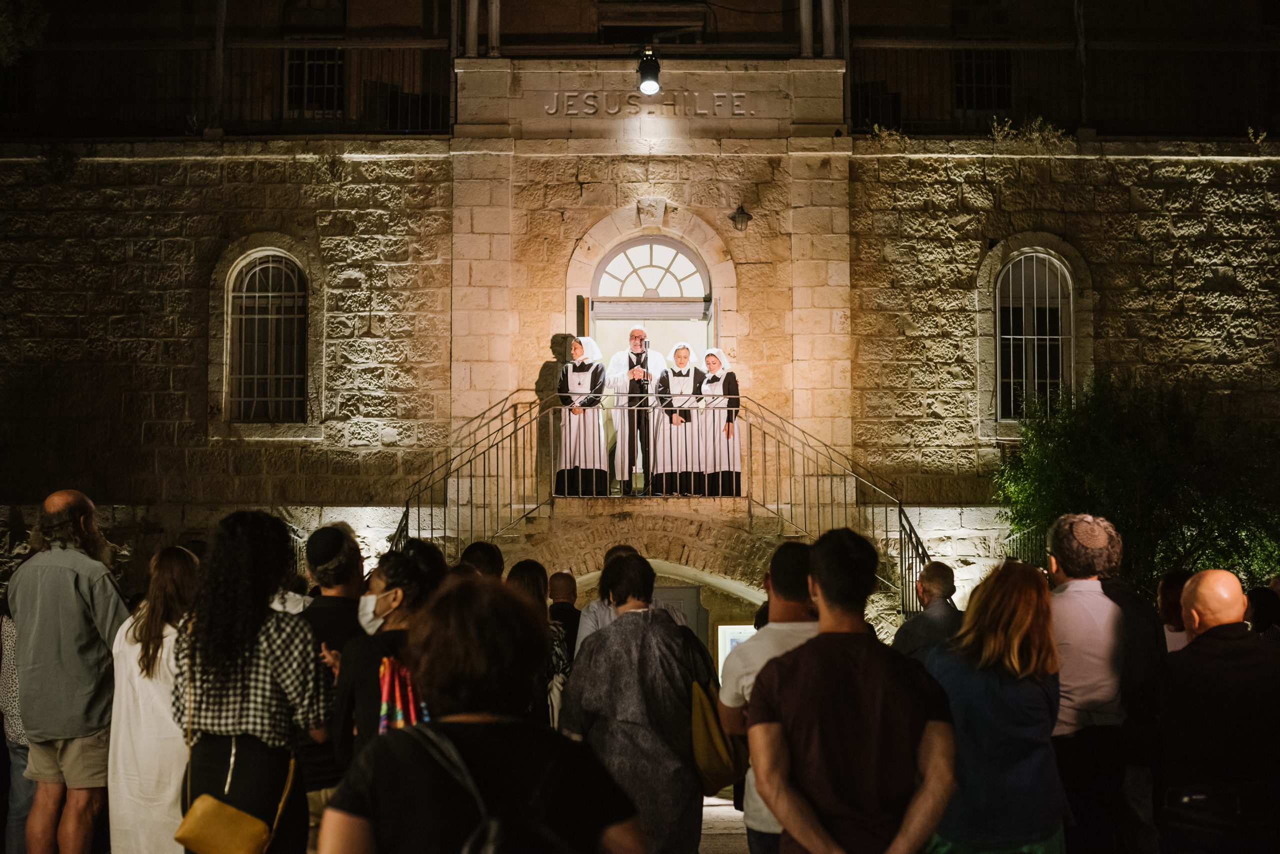 The play “A Wedding in Times of Plague” is an innovative and unique collaboration between two neighboring Jerusalem institutions—Hansen House and the Khan Theater, with the support of the Jerusalem Development Authority and the Jerusalem Foundation. The production featured Hebrew-speaking and Arabic-speaking actors, reflecting the microcosm of Jerusalem, then and now, and was accompanied by live music performed by four musicians.