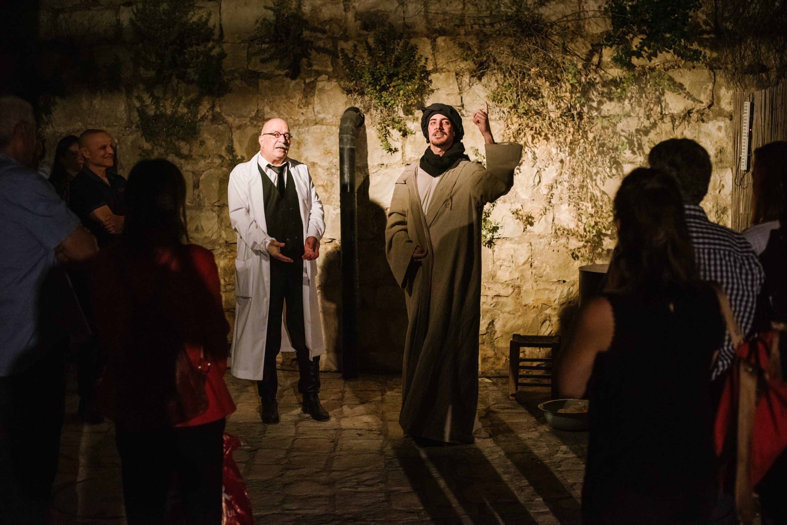 The story takes place at night, as darkness falls, and the old leper asylum comes to life – the head nurse and the director-general, German Christians, take the audience in four groups on a mysterious journey around the premises: the disinfection rooms, the treatment room, the attic, and the darkened garden. To overcome their loneliness and fear, the lepers perform a play for their guests, based on the story “In Times of Plague” by Y.L. Peretz. Measles, smallpox, and typhus have plagued the Polish town, and now everyone fears a cholera epidemic. The rabbi finds an ancient remedy to stop the plague: a “black wedding.” If the orphan Yosl marries an orphan in the dead of night in the cemetery, everyone will be saved from disaster.